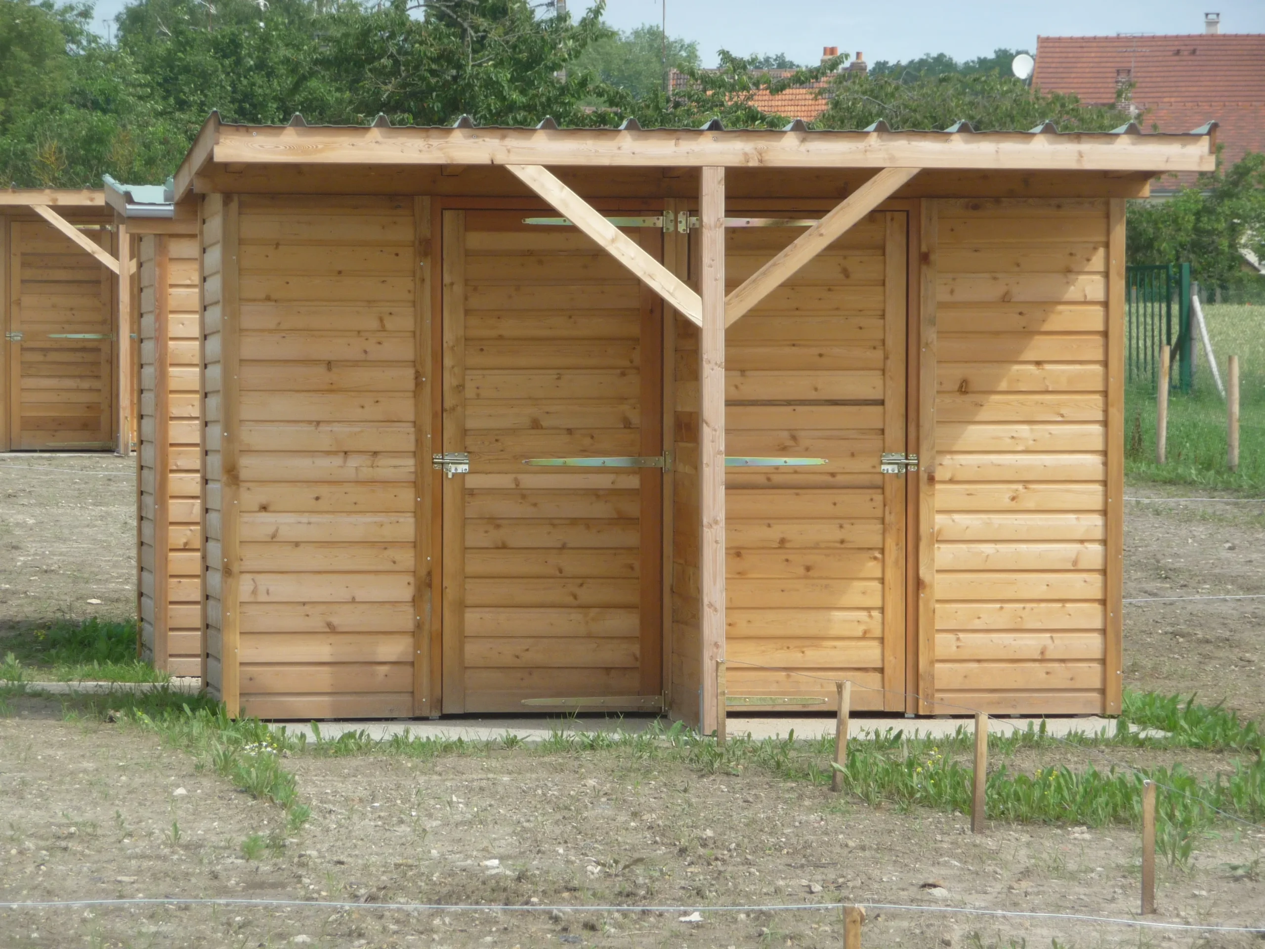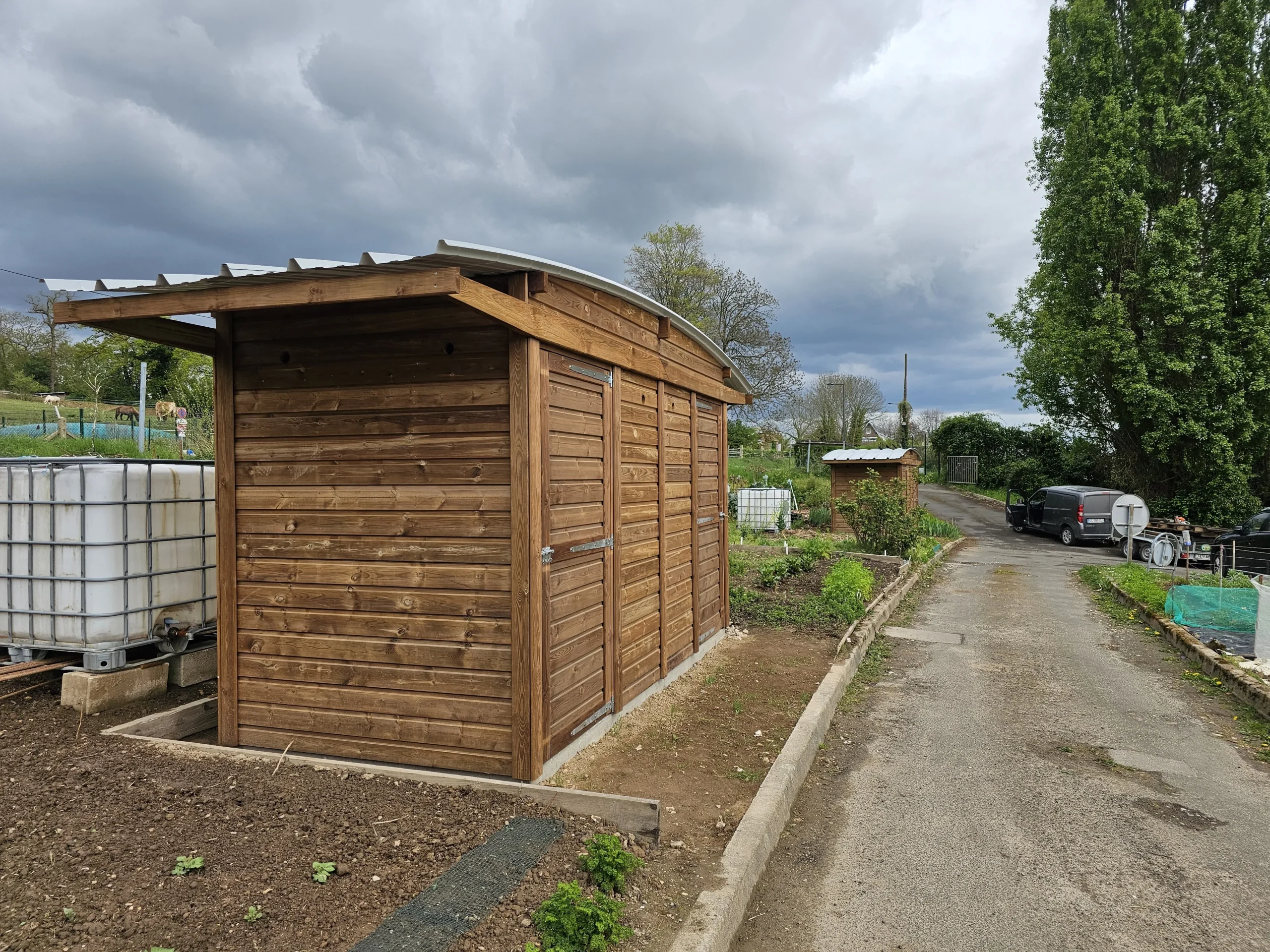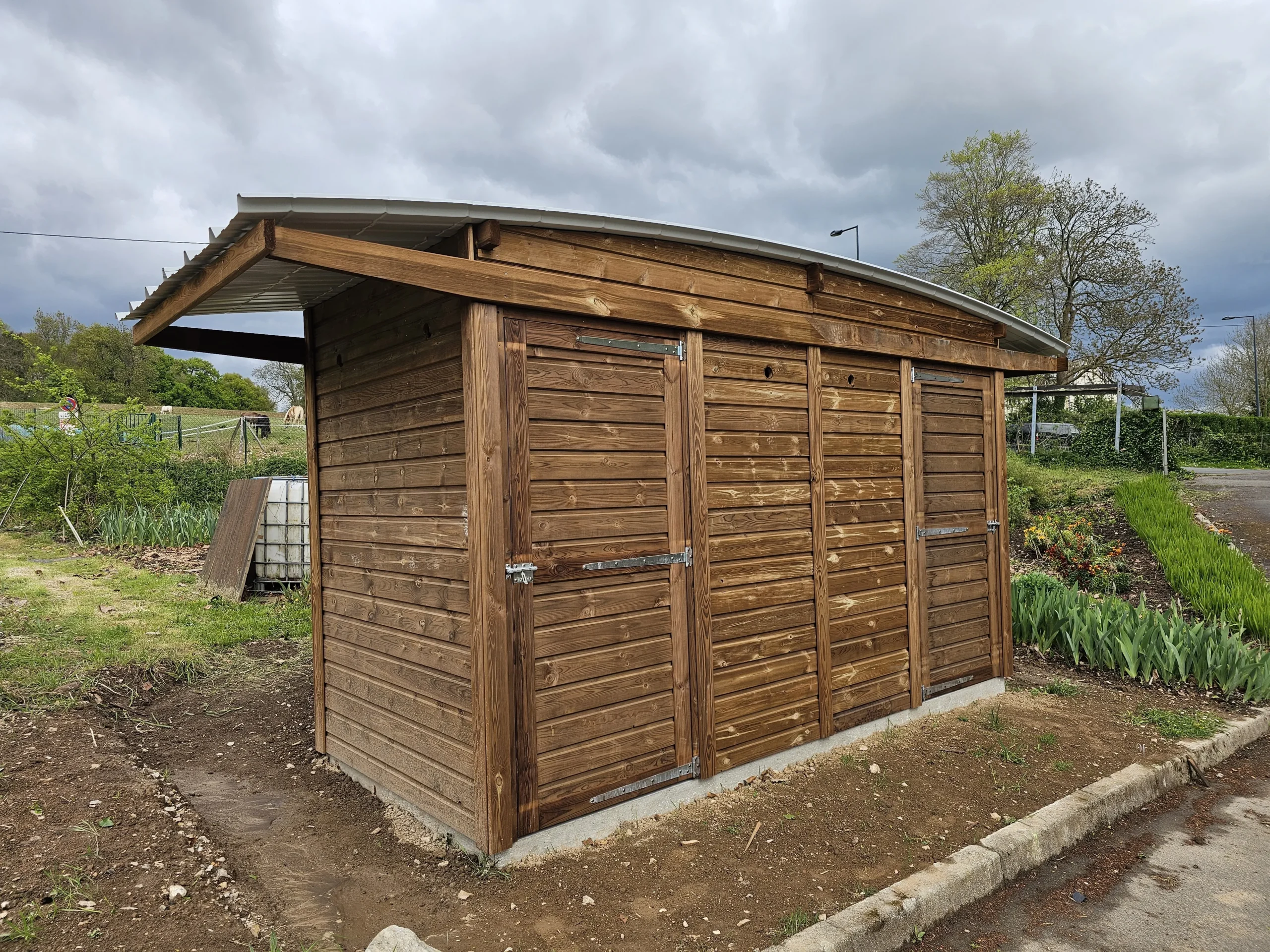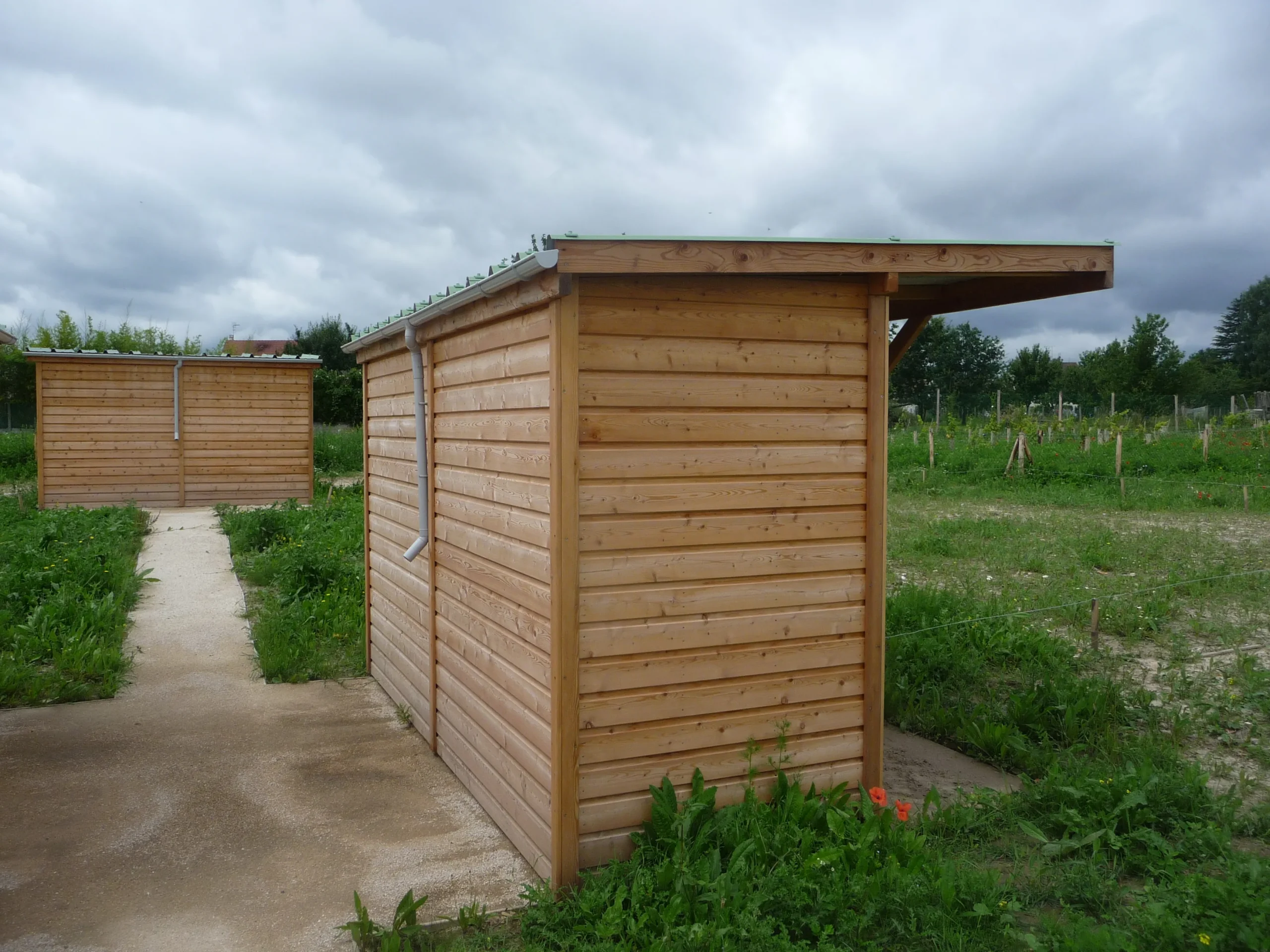 Les abris sont fabriqués en panneaux constitués d’une ossature en chevrons avec des clins rainures/languettes en bardage.