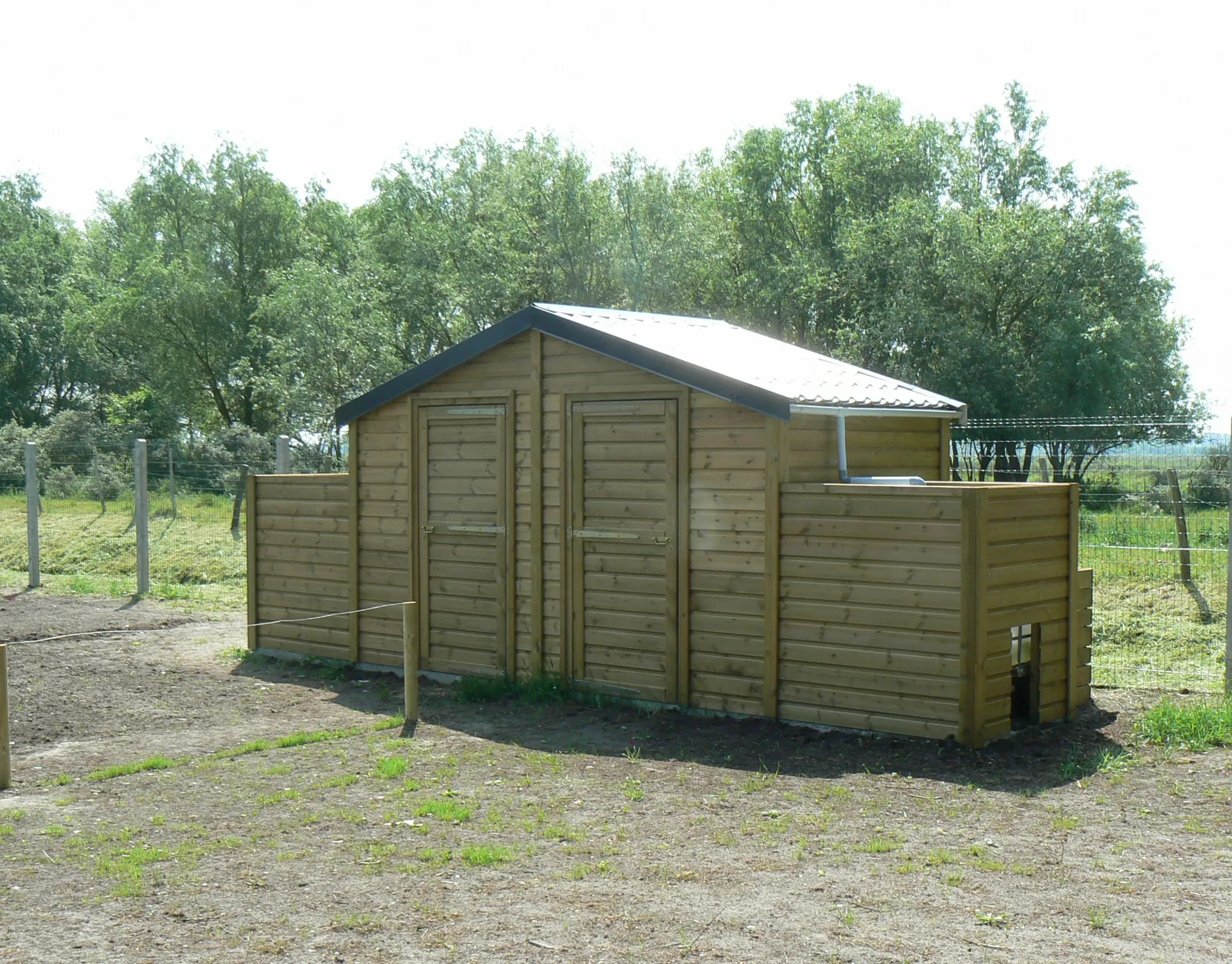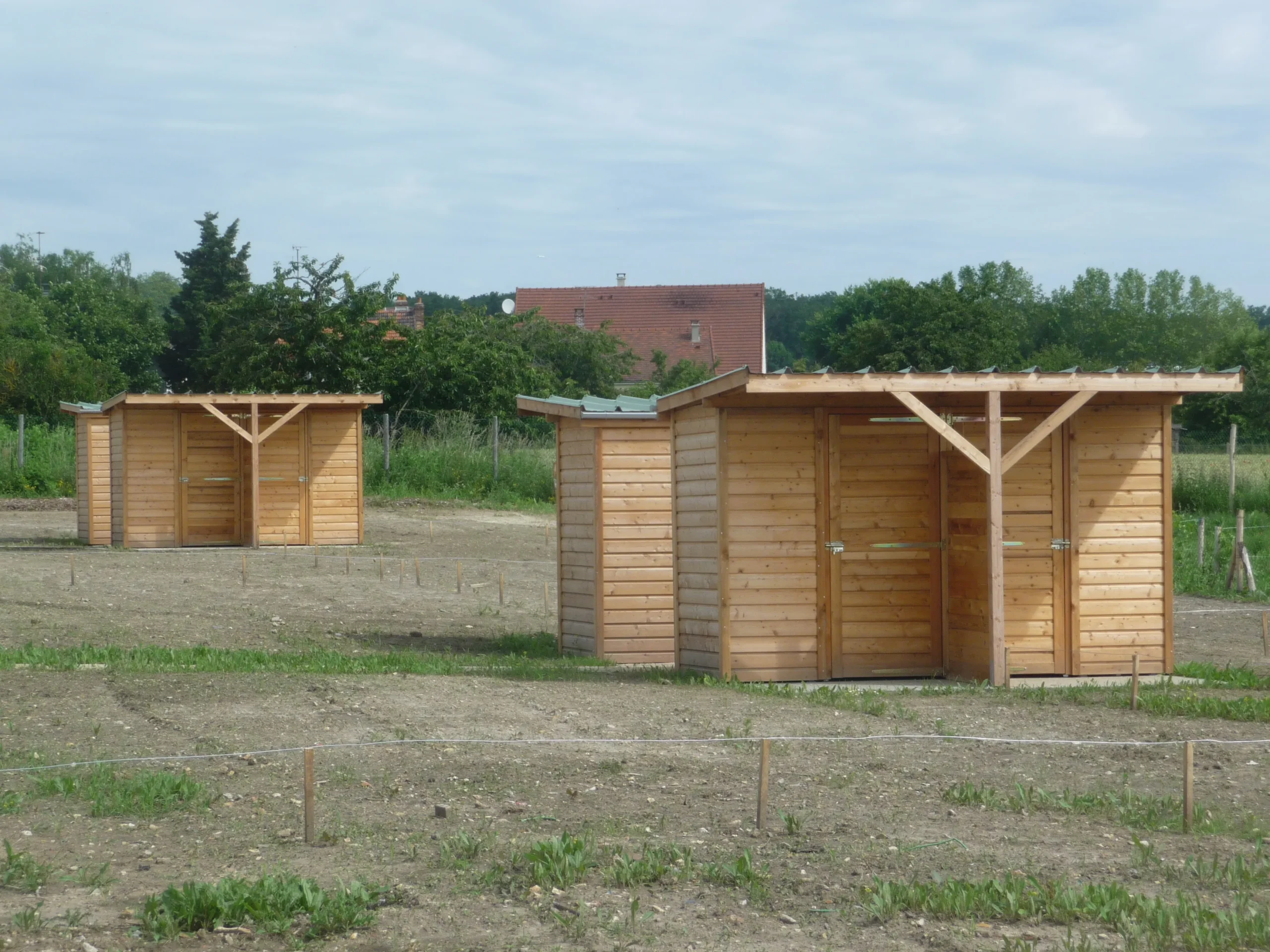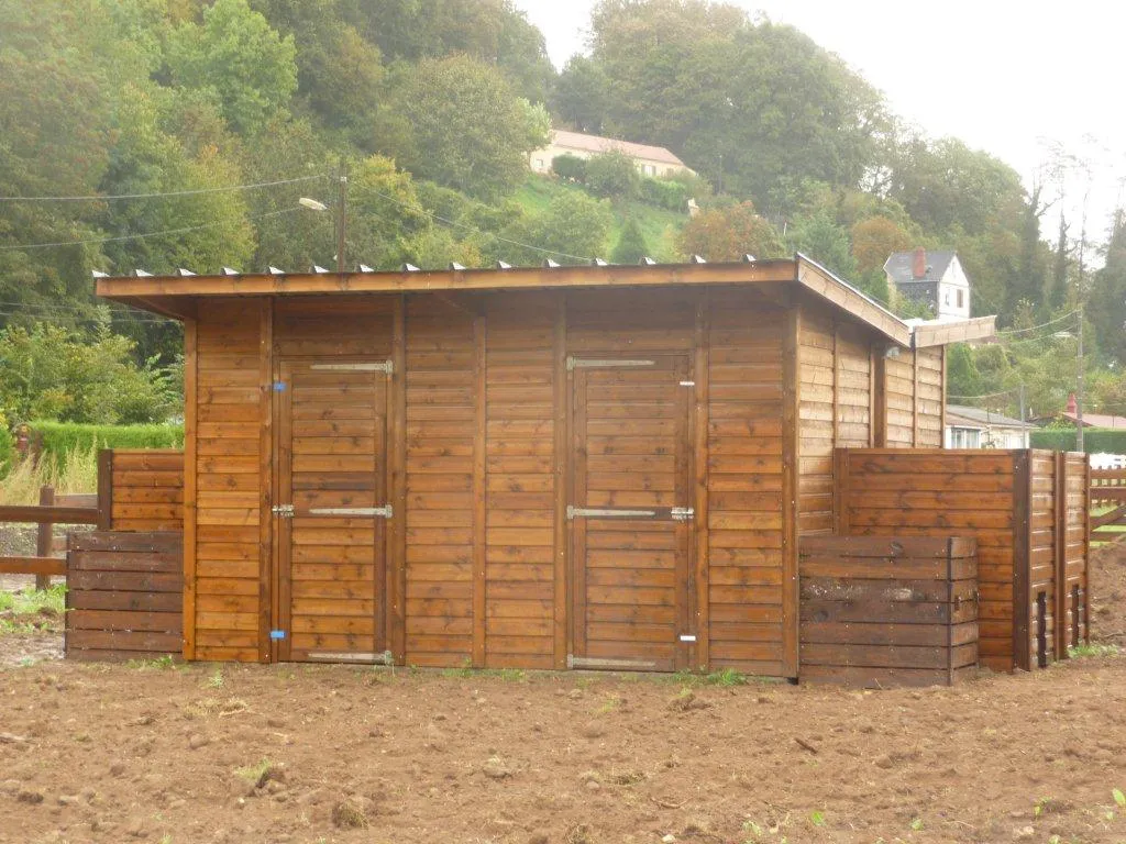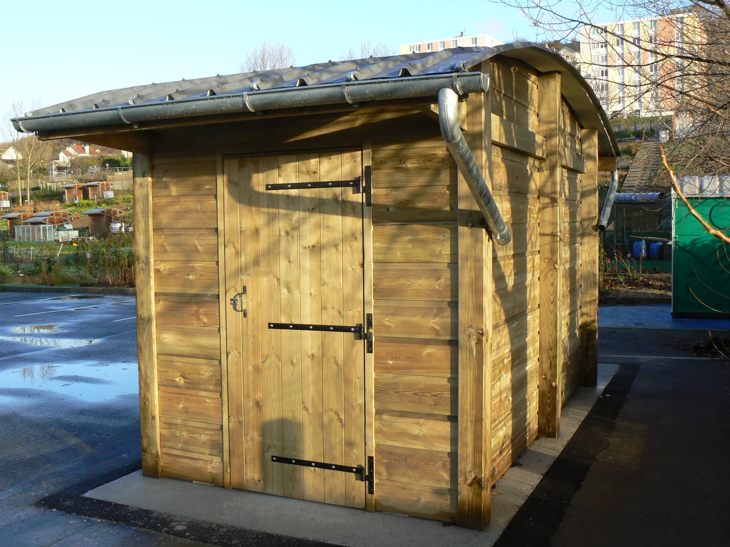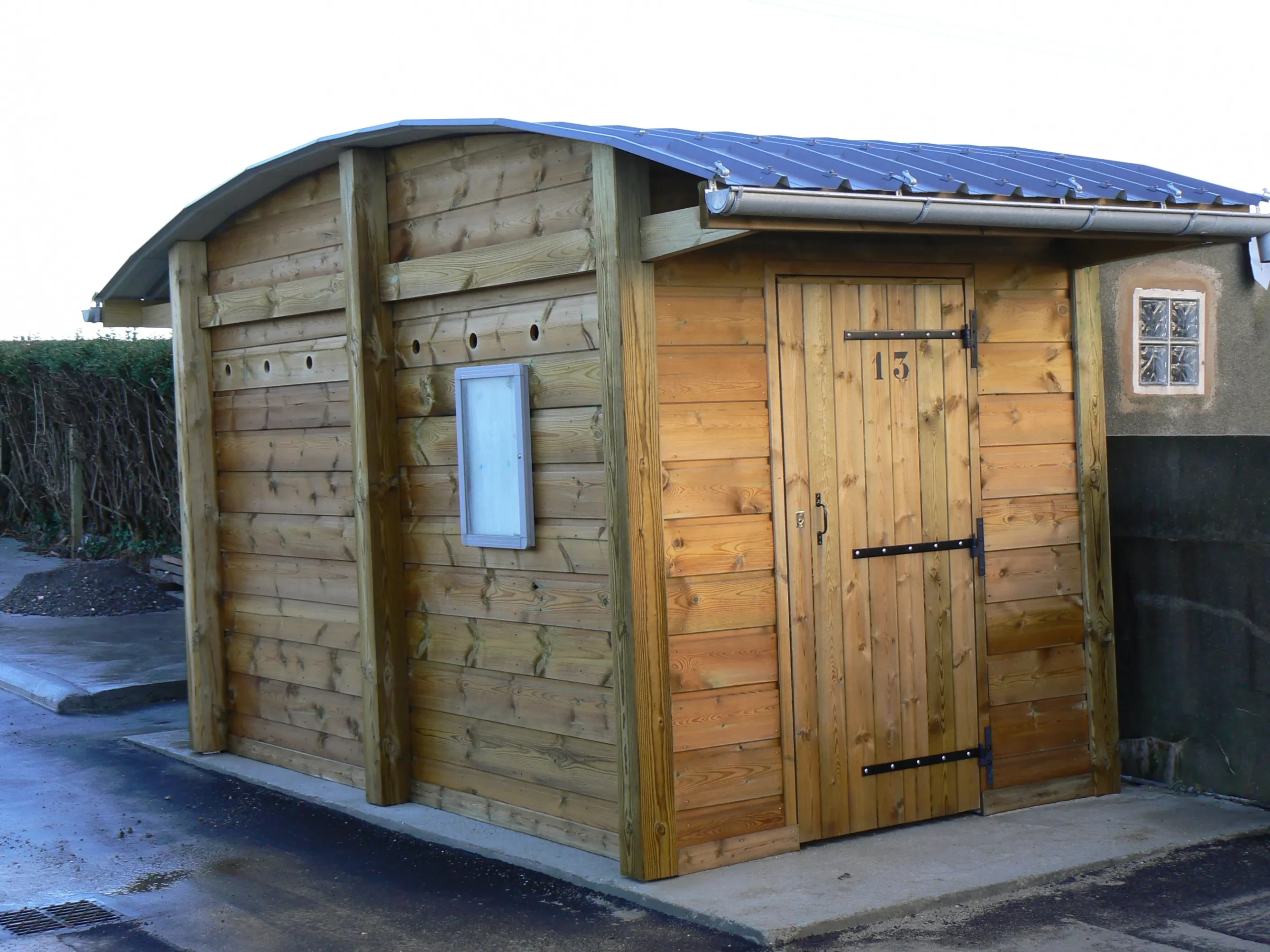 Les abris sont fabriqués en panneaux constitués d’une ossature en chevrons avec des clins rainures/languettes en bardage.