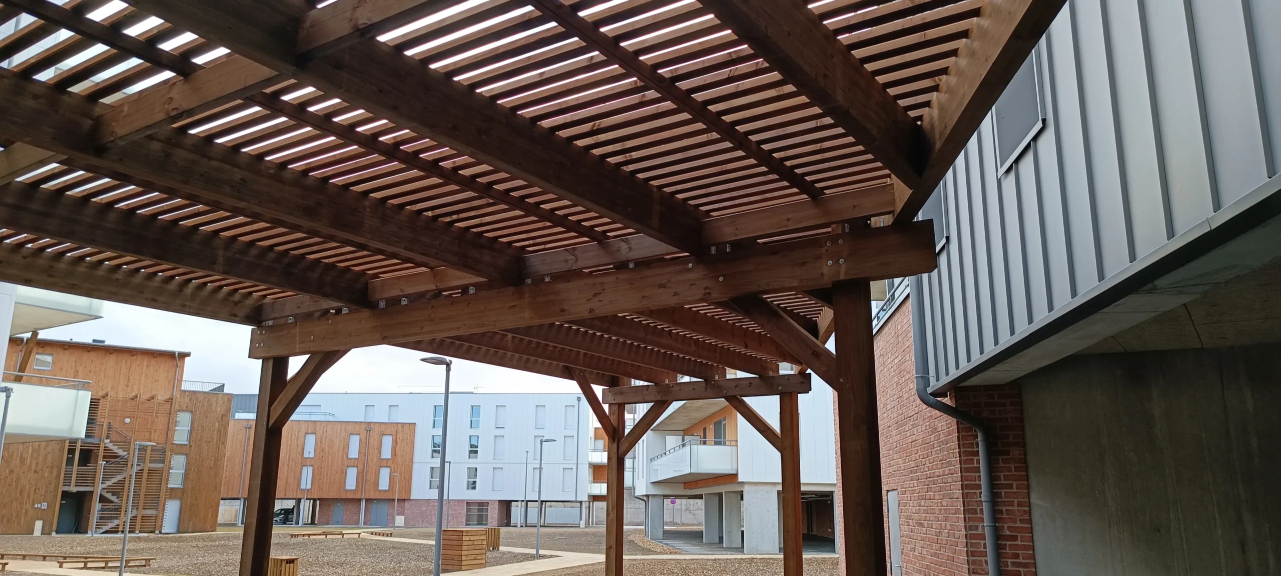 Les charpentes de ces bâtiments sont souvent taillées par machines à usinage numérique.