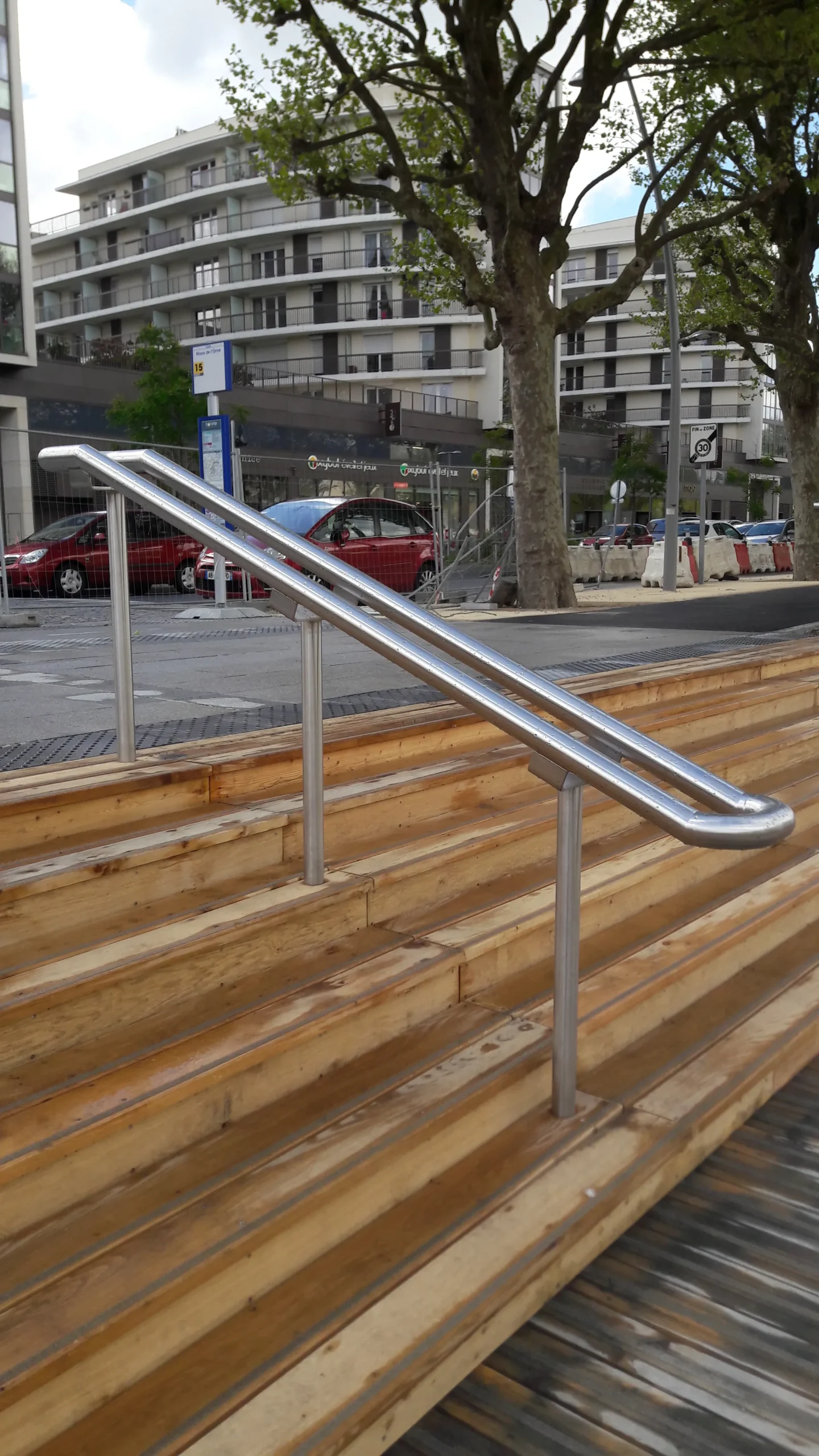 La hauteur de cette main courante est comprise entre 0.80m et 1m environ au-dessus du nez de marche.