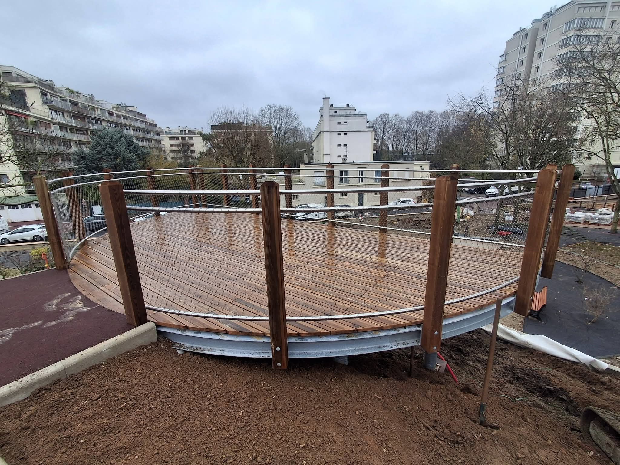 Les decks et belvédères sont parfois réalisés avec une ossature métallique et mis en place sur des pieux métallique battus ou vissés dans le sol portant.