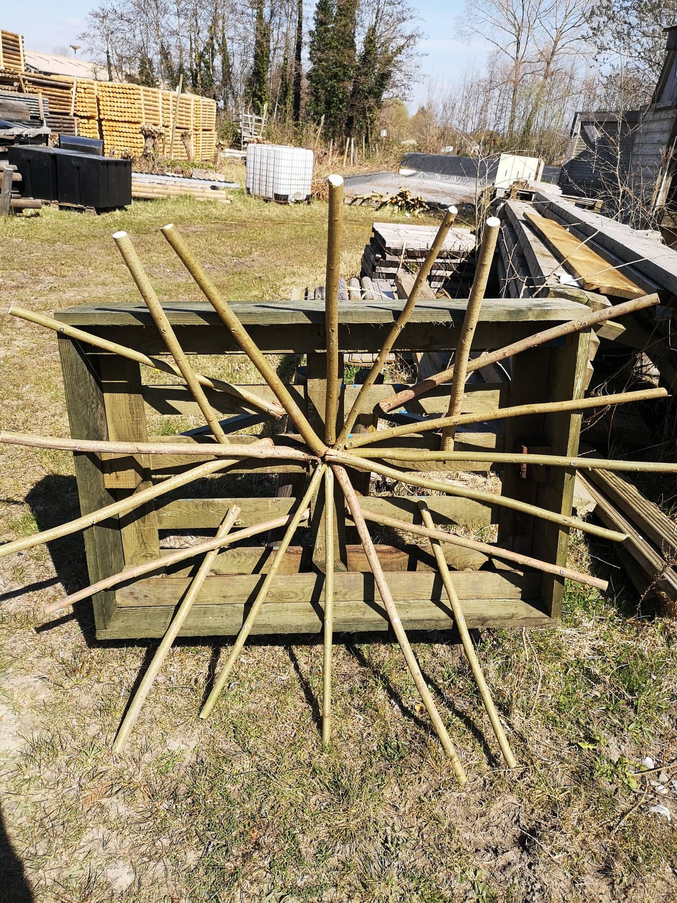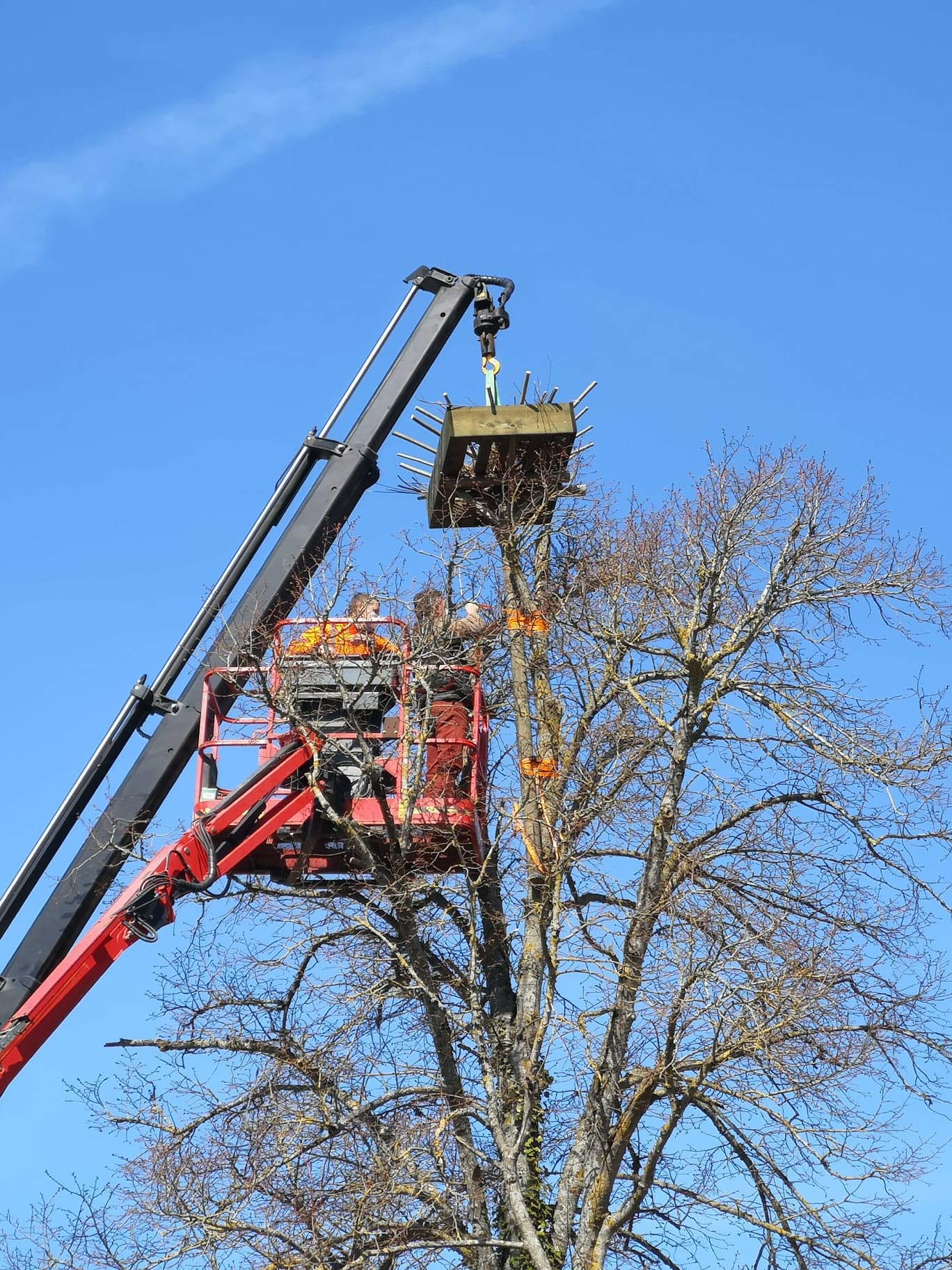 Les plateformes de reproduction pour les cigognes sont composées d’un mat de 6 à 8m sur lequel une plateforme en bois est arrimée.
