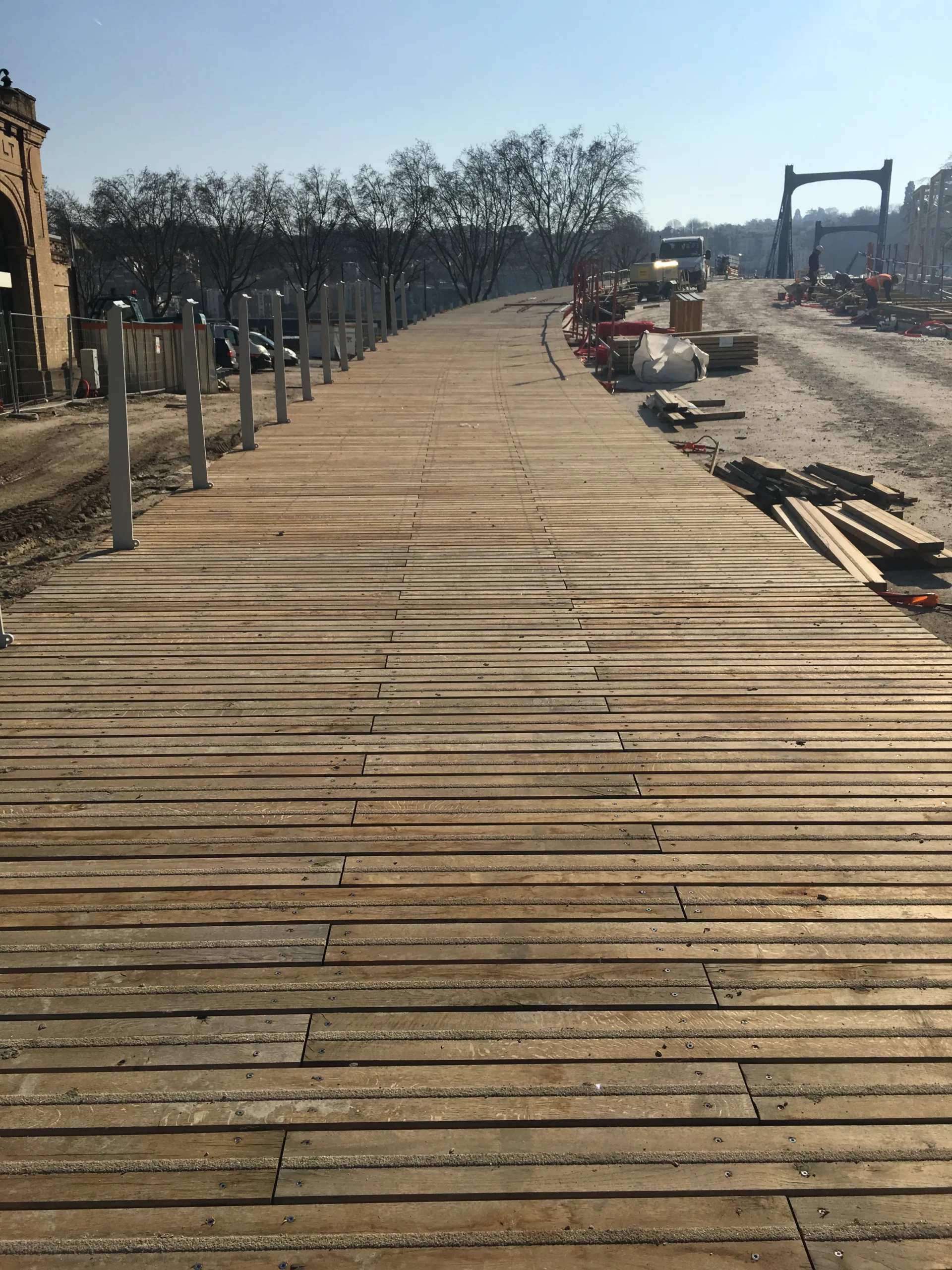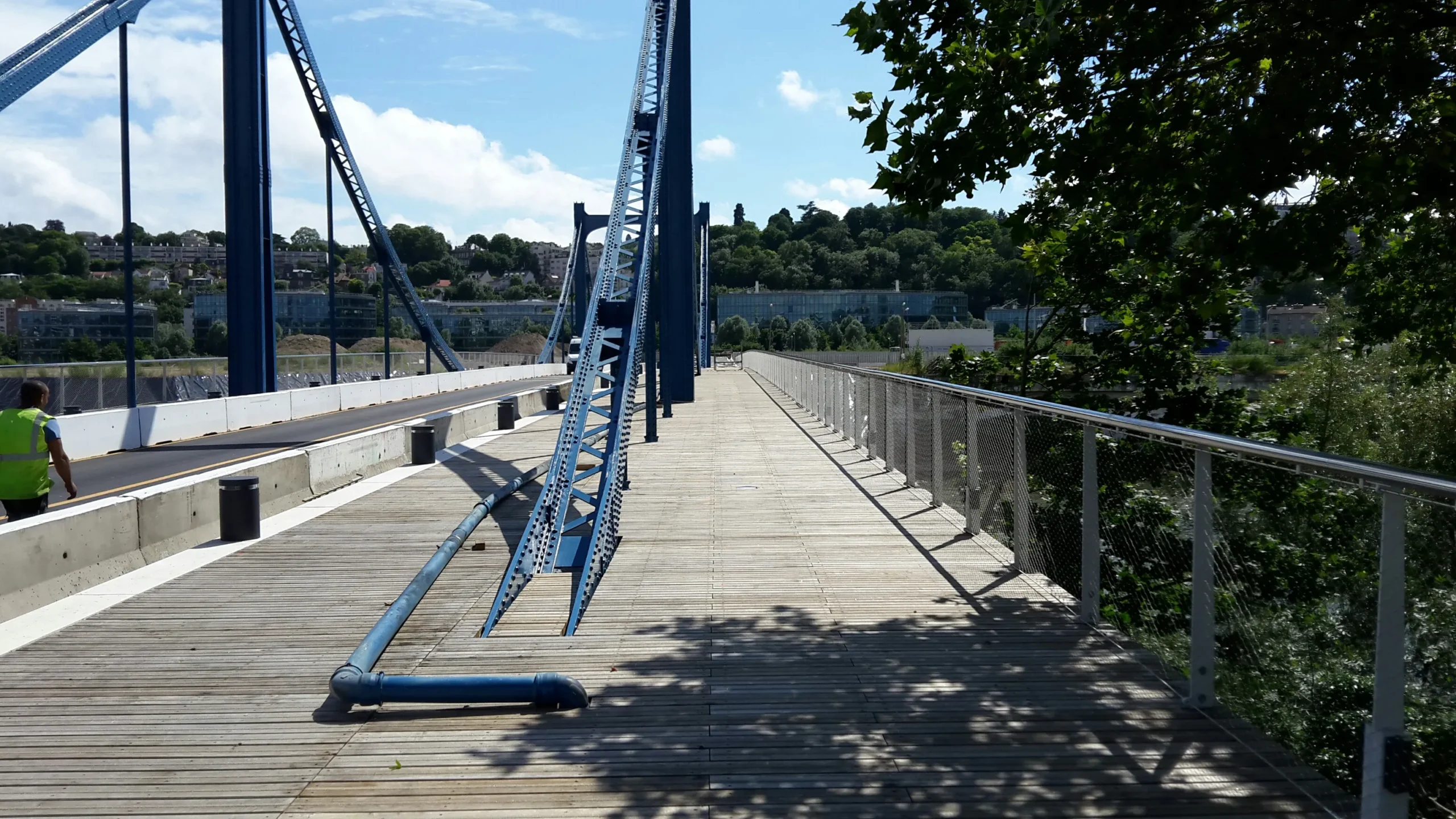 Les caillebotis sont fixés sur des portiques composés de pieux bois ou métalliques qui sont battus jusqu’à reprendre la descente de charge afférente à chaque pieu. Des moises sont réalisées sur les pieux par boulons galvanisés qui enserrent les traverses.