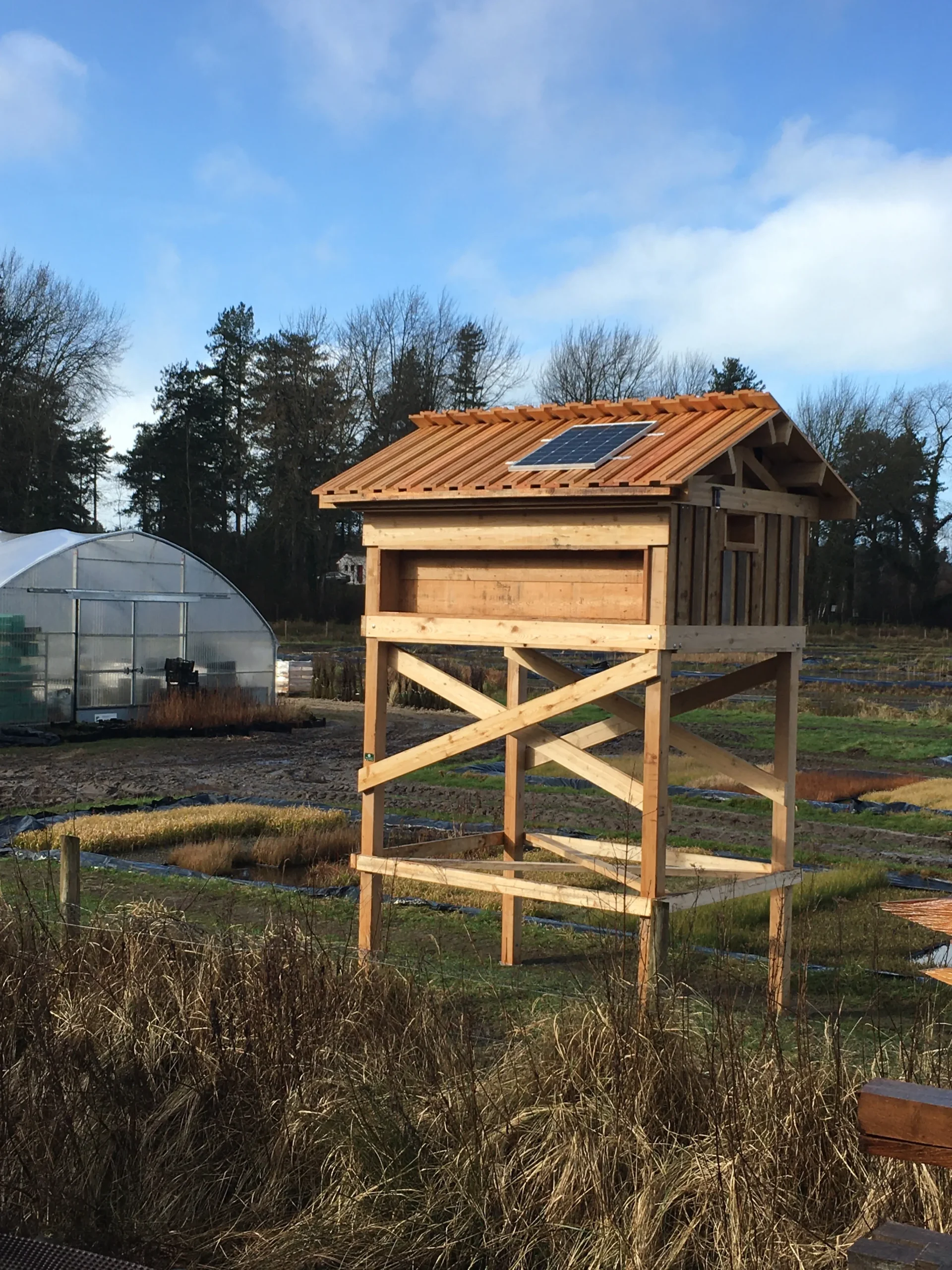 Abri en bois surélevé conçu pour favoriser la nidification des hirondelles